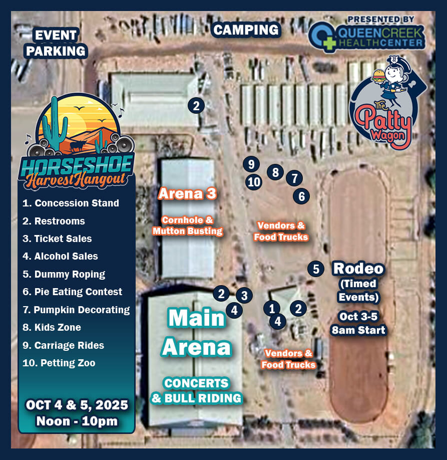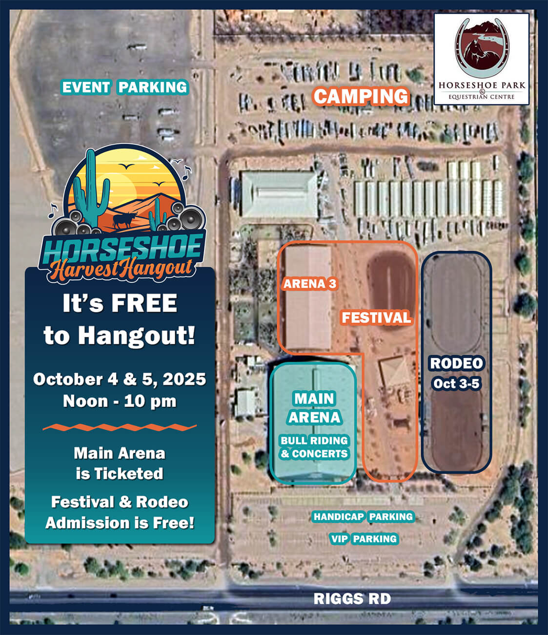 Horseshoe Harvest Hangout, presented by Queen Creek Health Center, is set to be an unforgettable weekend of Live Country Music, Bull Riding, Rodeo and a Family Fun Festival! Horseshoe Park & Equestrian Centre will come to life with the biggest concerts the venue has ever seen, plus an unbeatable lineup of fun from Noon to 10 pm each day!